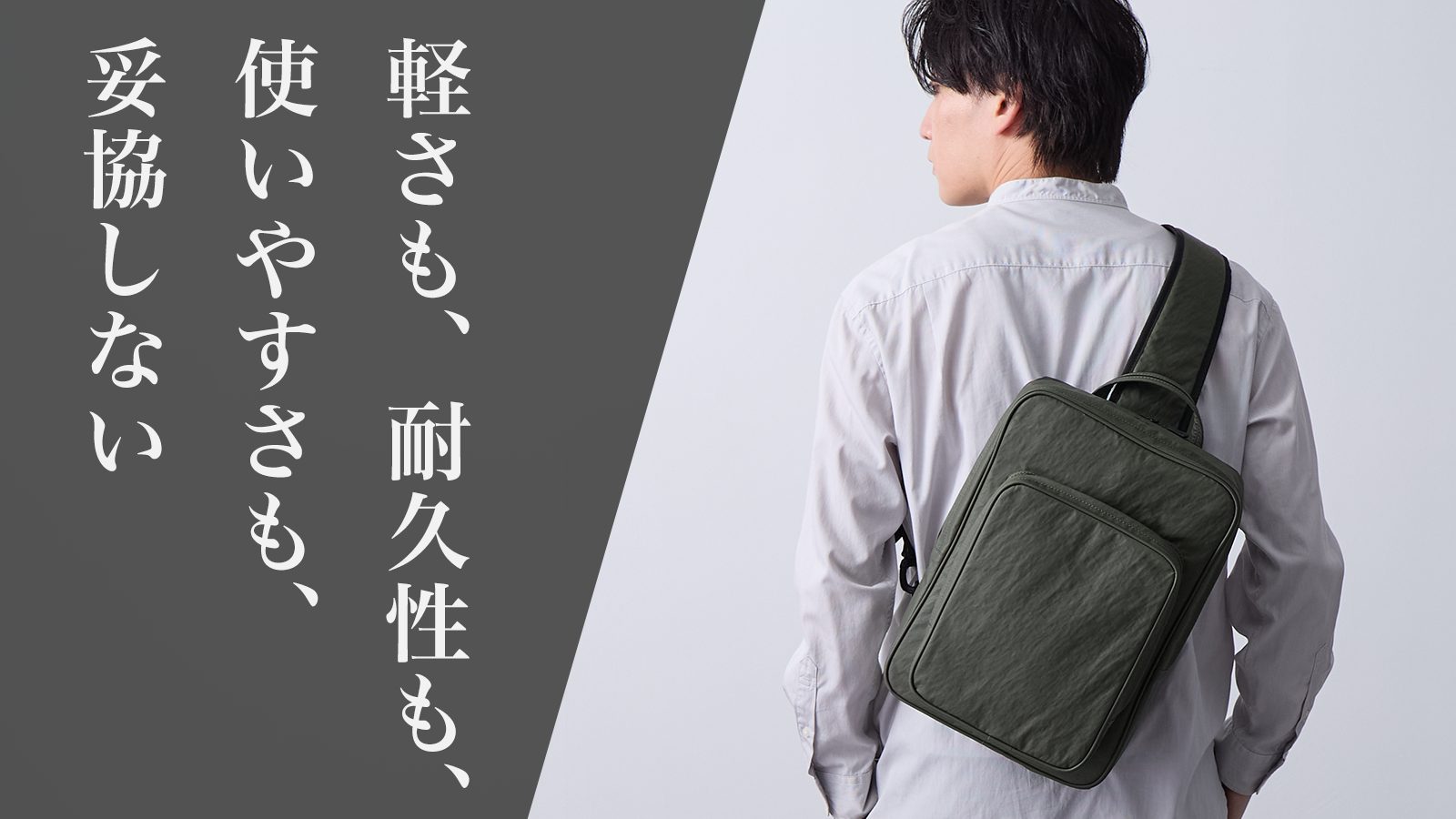 3. バッグ専業メーカーが、軽さと風合いをとことん追求。軽いのに自立し型崩れもしにくいスリングバッグ